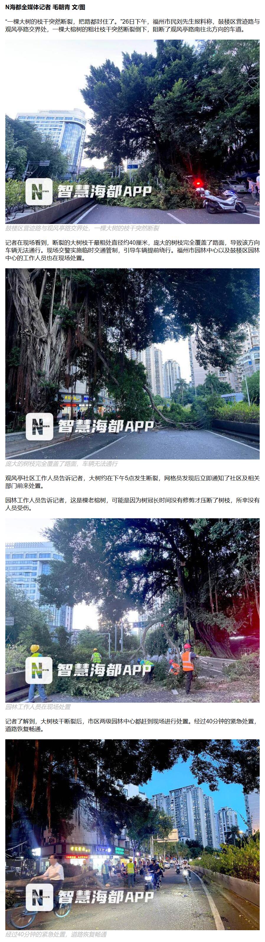 福州市区一榕树枝干断裂,堵住车道!园林部门40分钟紧急清障