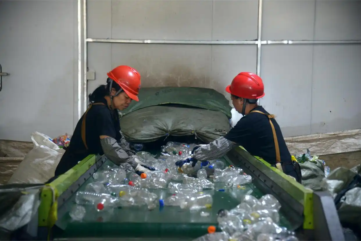 在位于福州马尾区的福州城投再生资源分拣中心,工人整理智慧光选机筛选后的可回收垃圾(9月13日摄)。新华社记者 李昊泽 摄
