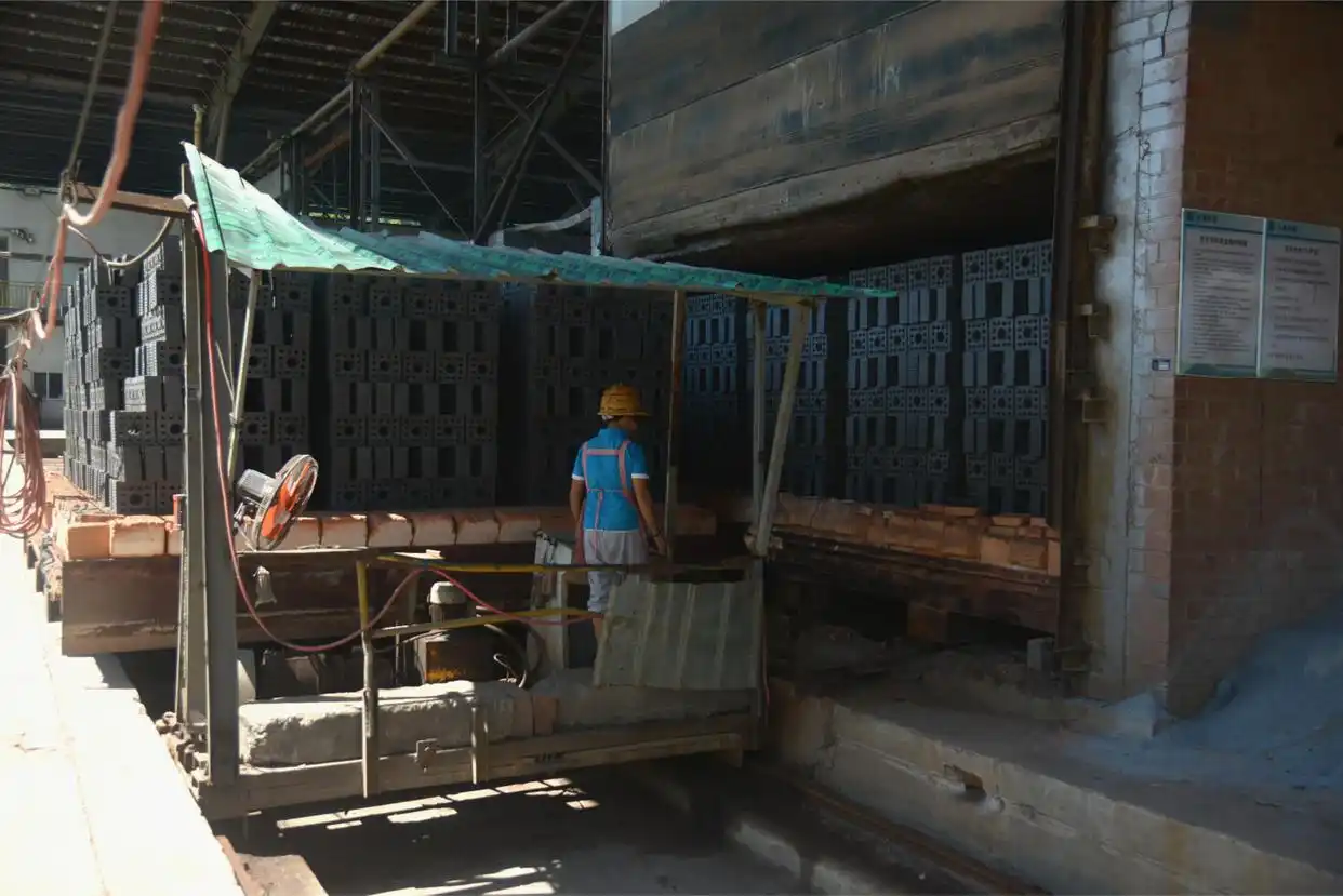 在福州闽侯县一家建筑垃圾资源化利用企业的生产园区,工人将一批由建筑垃圾制作的砖坯送入焙烧设备(9月13日摄)。新华社记者 李昊泽 摄